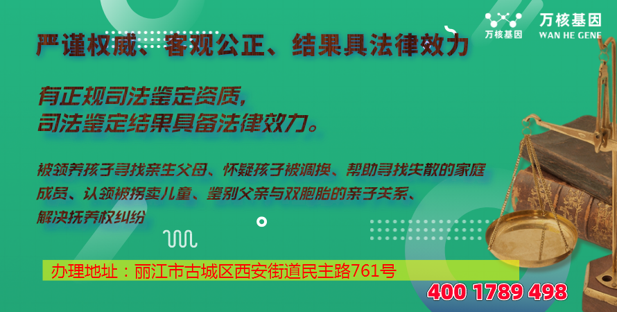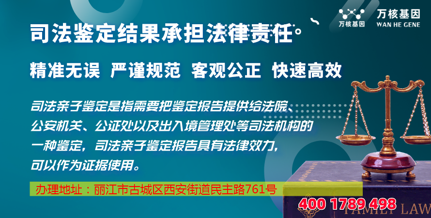 在科学面前真相只有一个,丽江万核亲子鉴定咨询中心抱着这样的信念,怀着对DNA科技的景仰和虔诚的这一个的目标,我们走出了一条严谨而深远的道路.....,我们采用严格技术标准为社会各界提供亲子鉴定和个人身份识别的服务,对于dna司法鉴定经过一系列严格、公正、公开的司法公证程序,出具的鉴定报告具备法律效力,全国通用(注意:司法鉴定需要符合一定的法律程序和标准,具有法律效力,而无创胎儿亲子鉴定是由个人自愿选择进行的,仅供参考,不能替代司法鉴定的作用。因此,在司法领域中,需要进行亲子关系鉴定时,仍然需要通过正规的司法鉴定机构进行鉴定。)
